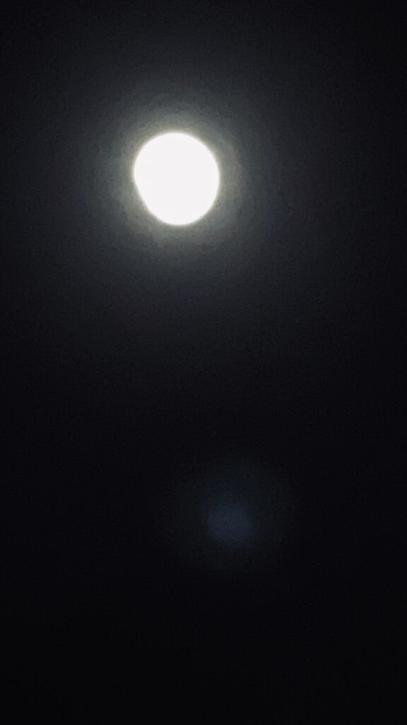 なんだか赤いような、橙色のような、妖艶な色の満月が小さく見えました。